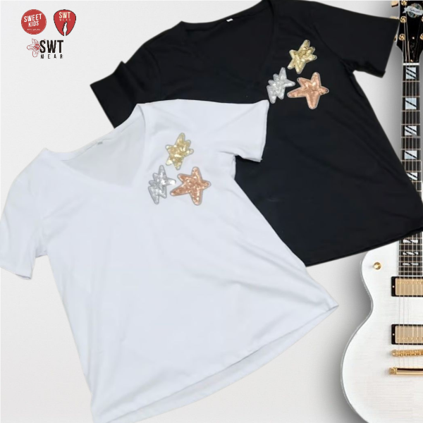 Remera Estrellas Lentejuelas Algodón Escote en V Hasta 4XL